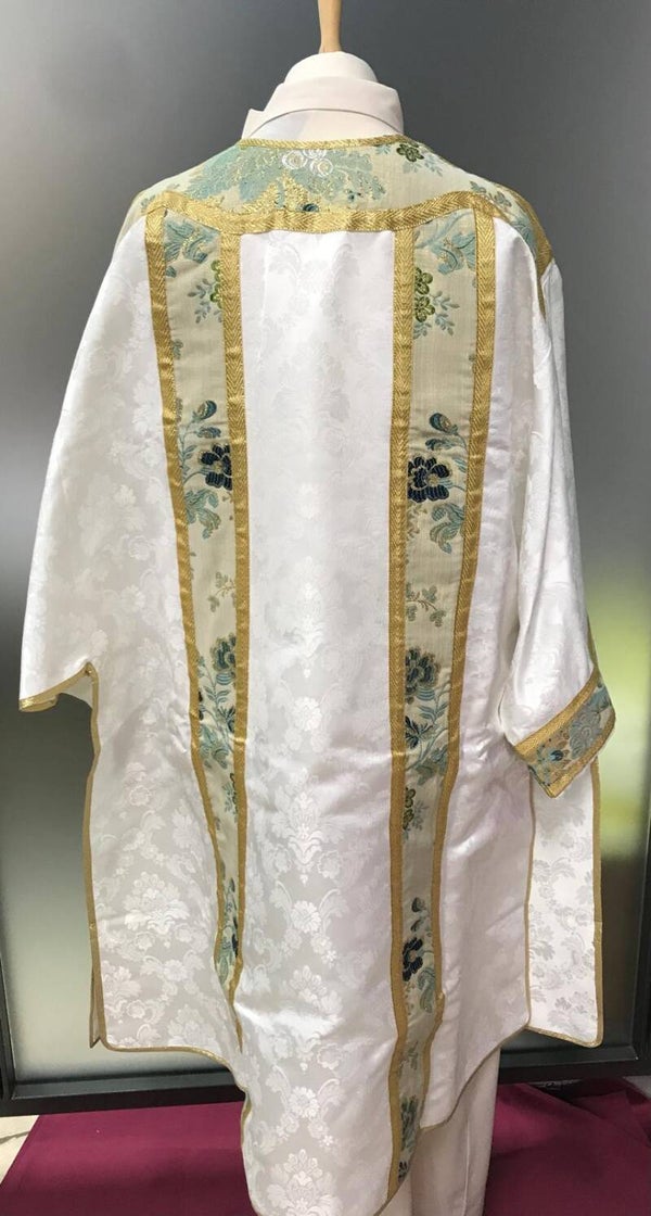 DALMATICA COLORE BIANCO, IN TESSUTO DAMASCO, 100% POLIESTERE, CON BORDO MARIANO FRONTE/RETRO COMPLETA DI STOLA