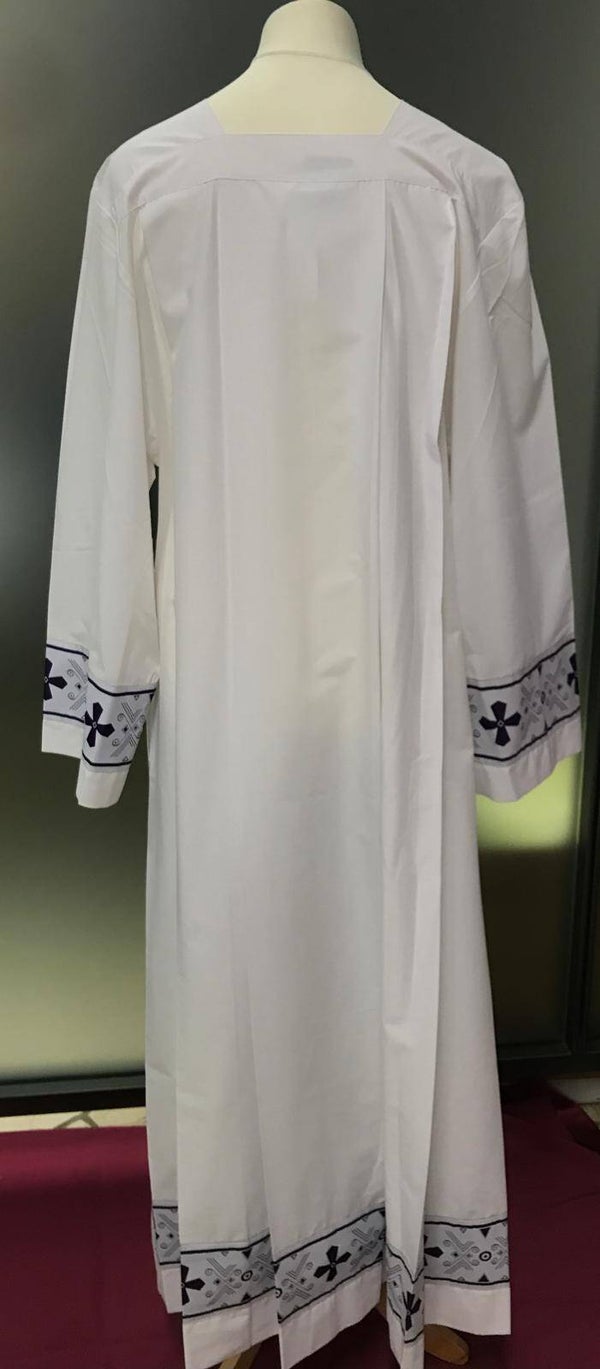 CAMICE COLLO QUADRO IN MISTO COTONE, 60%POLIESTERE, 40% COTONE, COLOR BIANCO CANDIDO, CON BORDO VIOLA SUL FONDO E SULLE MANICHE, CM 150