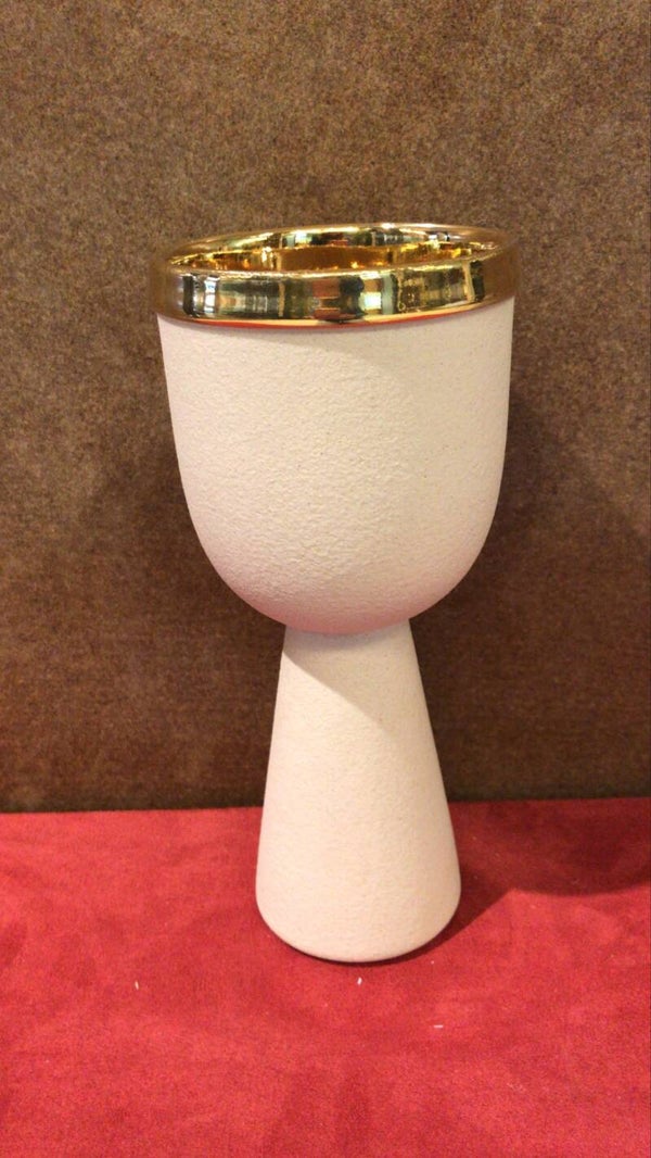 COMPLETO IN GRES PORCELLANATO, COLORE BIANCO ALL'ESTERNO E DORATO ALL'INTERNO, COMPOSTO DA CALICE H 20 CM, PIATTO PATENA DIAMETRO CM 12,5, PATENA DIAMETRO CM 15