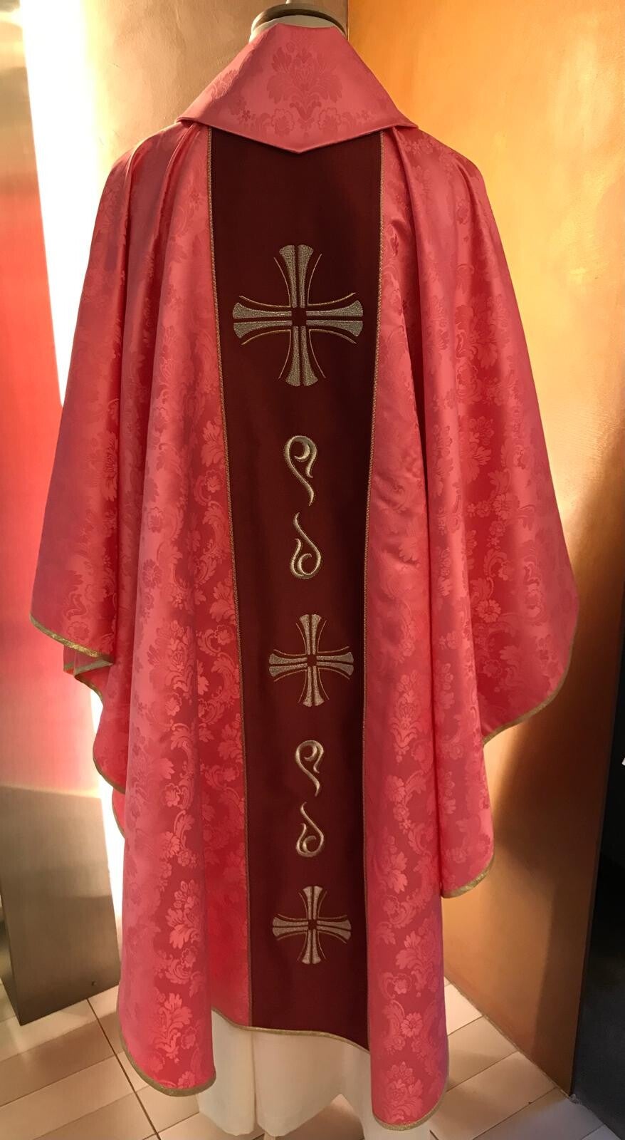 CASULA COLORE ROSA, IN TESSUTO DAMASCATO, 100% POLIESTERE, CON STOLONE RICAMATO FRONTE/RETRO COMPLETA DI STOLA